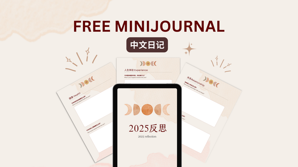 Write and think in Chinese using this mini-journal designed for Chinese learners. It has 12 questions to help you reflect on your life in 2025 from the aspects of health, relationship, career, and personal experience. Respond by writing or recording your voice. Have fun practicing Chinese and learning Chinese!